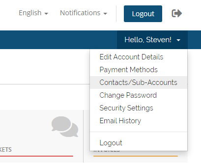 2. Once you have logged in, please click your name with the drop down arrow at the top right then select “Contacts/Sub-Accounts”