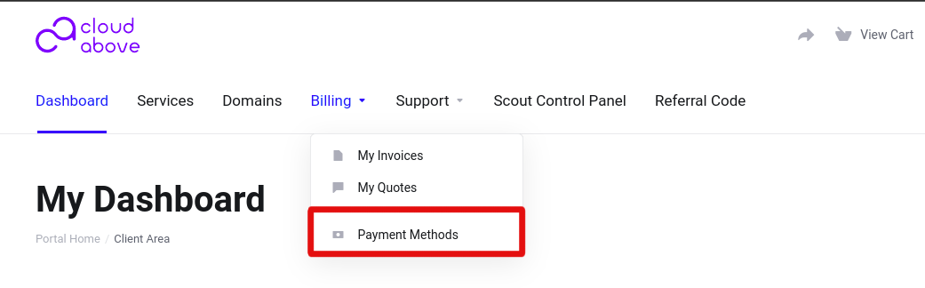 Once you have logged into your client area, go to Billing > Payment Methods