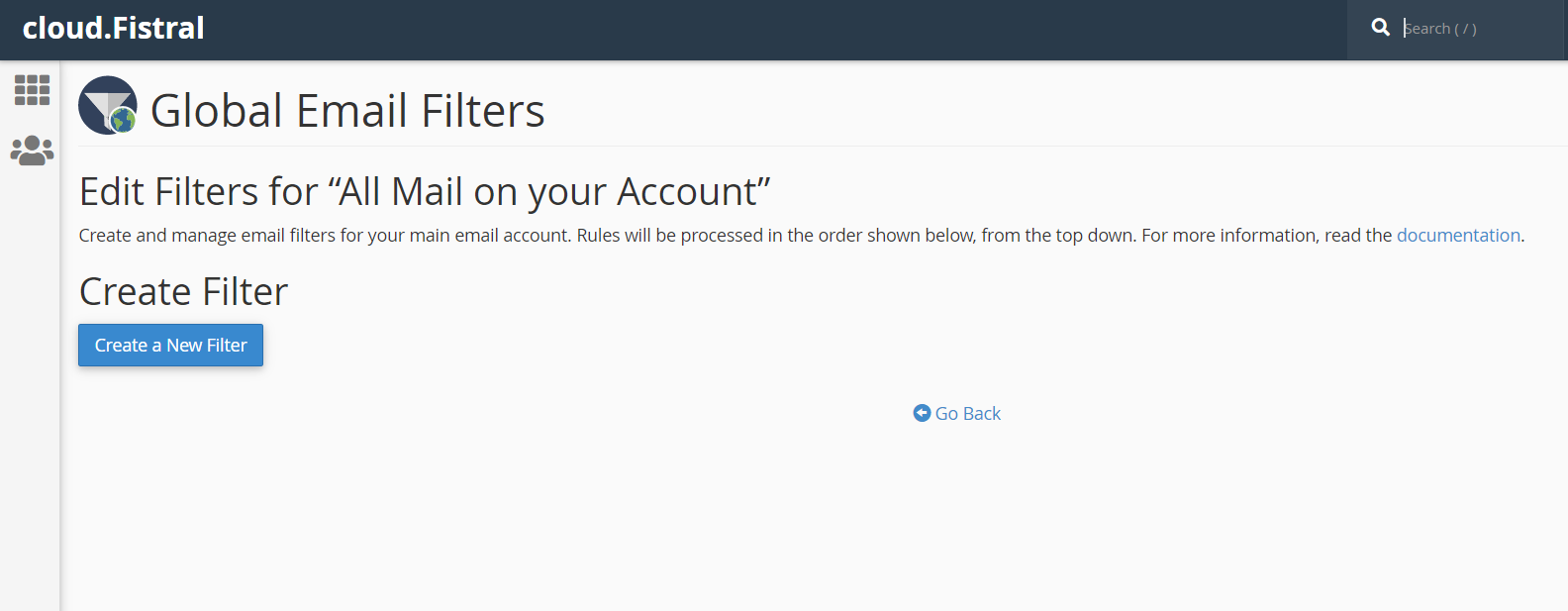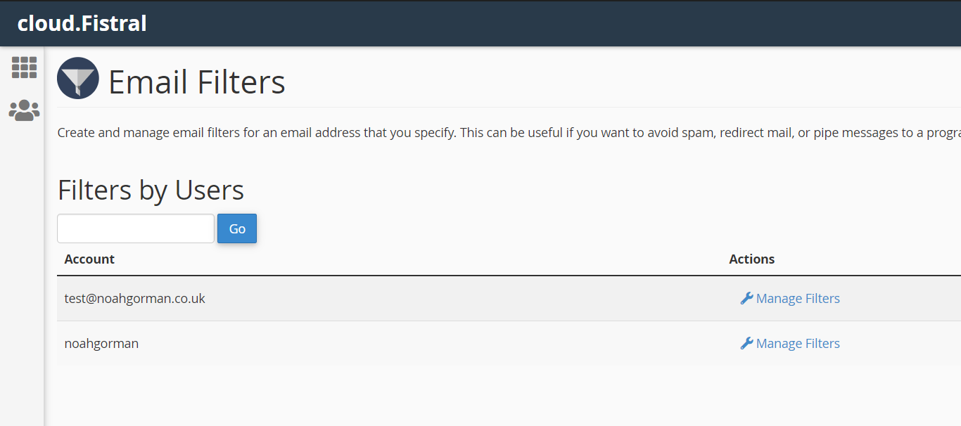 3. For configuring individual email filters via Email Filters, choose the email account you want to create a filter for by clicking Manage Filters, (See image 1) then click Create a New Filter. For Global Email Filters just click Create a New Filter (See image 2).