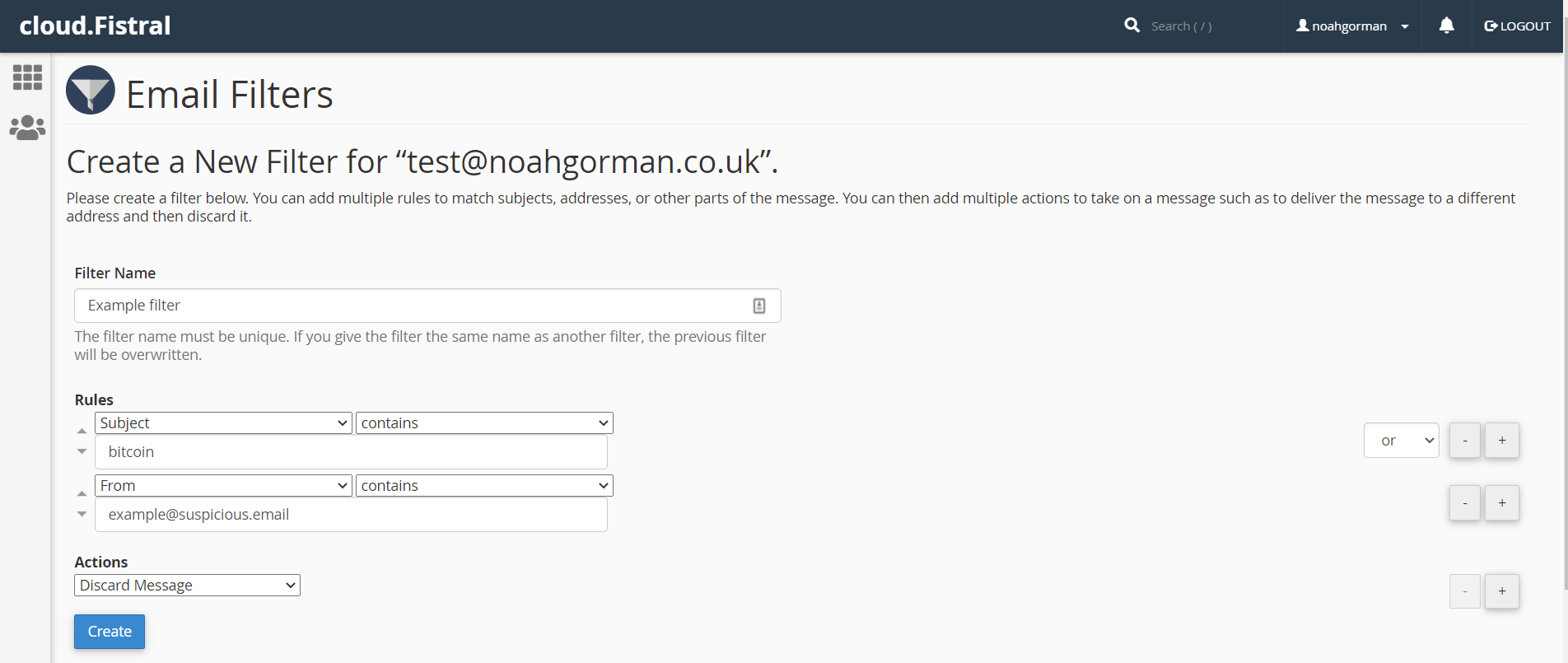 4. On this next screen you can configure the email filters to do various tasks based on the specified criteria, for example you can discard any emails that have the word "bitcoin" mentioned in the subject line. You can also set more than one criteria for each email filter, for example a single email filter may filter emails that have "bitcoin" in the subject line, or came from the email address example@suspicious.email. To save the filter simply click Create.
