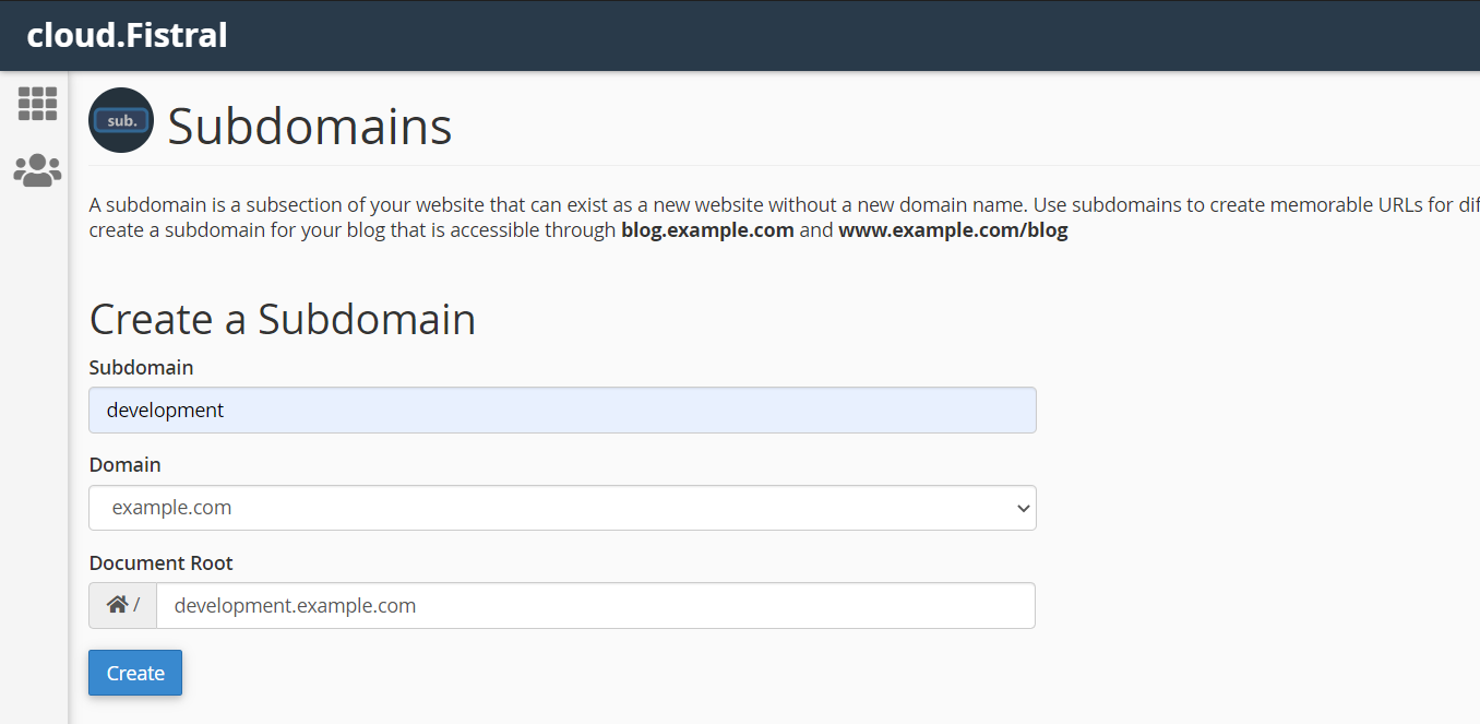 2. Create a subdomain via cPanel > Domains > Create A New Domain. The subdomain can be called whatever you like, although it's recommended to use a descriptive subdomain e.g. staging.example.com, dev.example.com etc. or something that is specific to the project e.g. Joesnewblog.example.com etc.