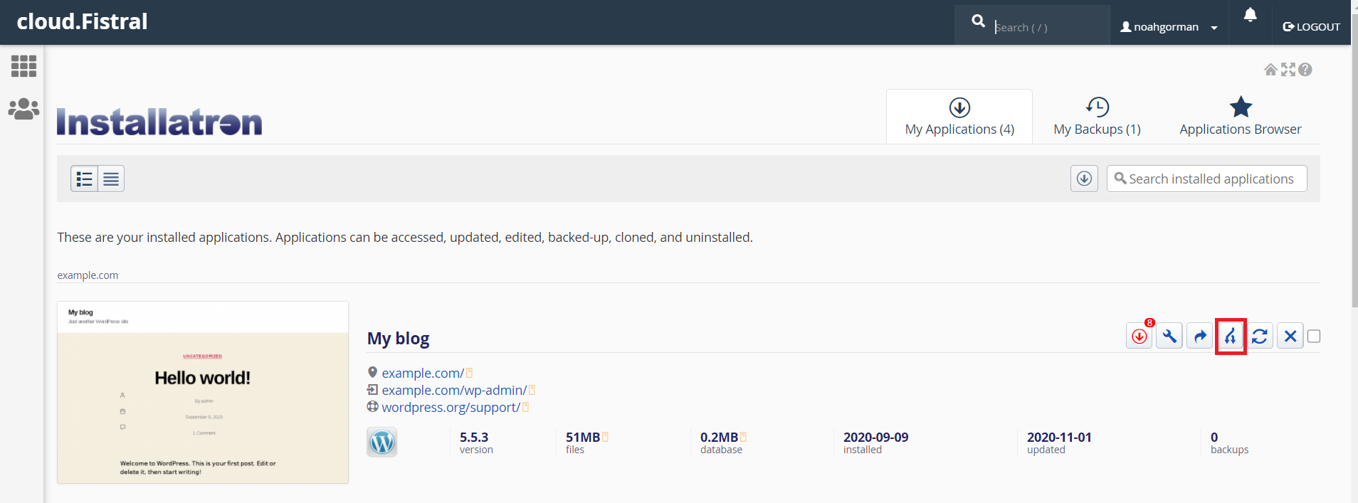 4. Under My Applications find and select the website that you wish to clone, then click on the "Clone" button located on the right side of the page.