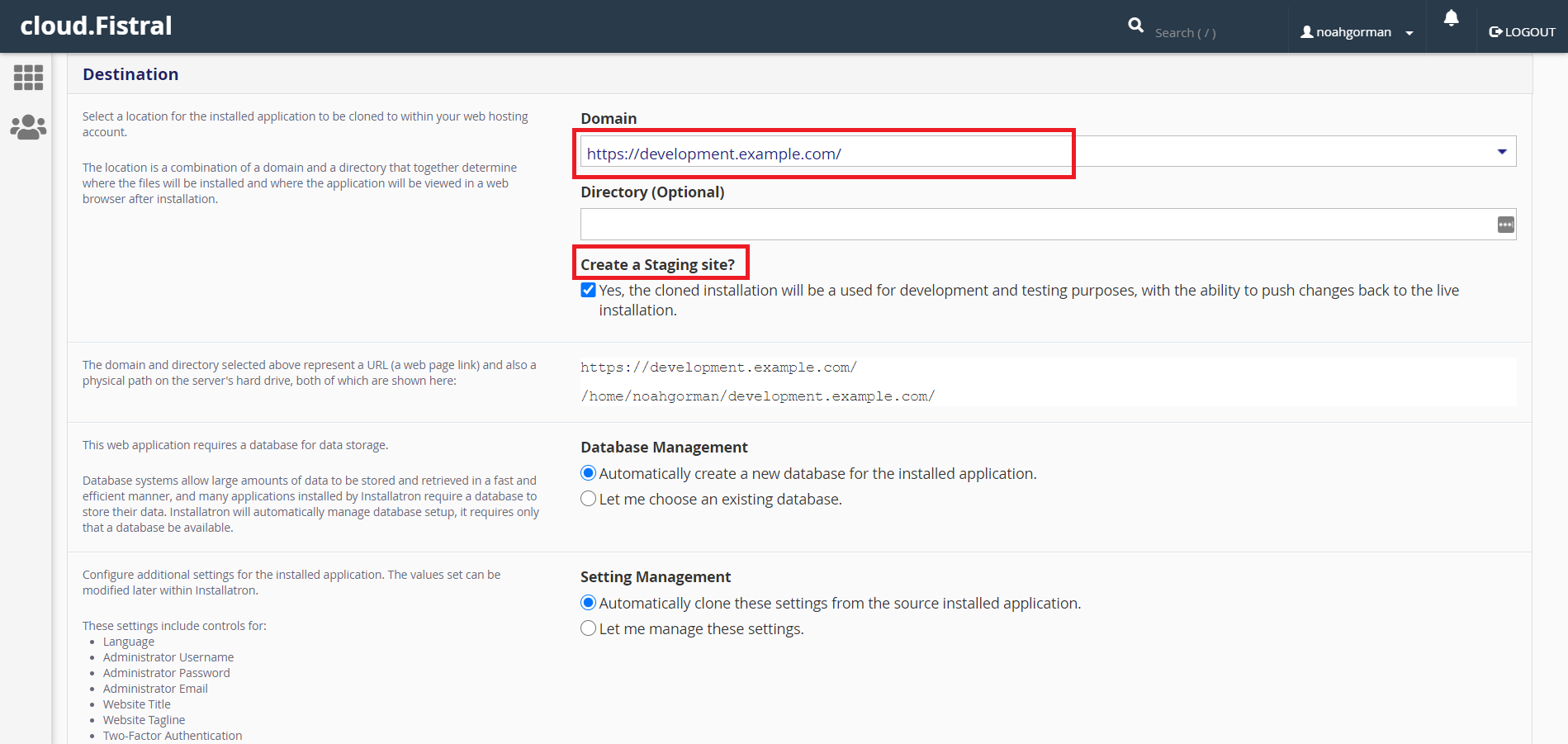 Note: Unless you chose to use different settings for your cloned website in step 5, all of your settings will be the same as the website that you cloned. i.e. in this guide we cloned example.com into development.example.com, so development.example.com will have retained the same settings as example.com.