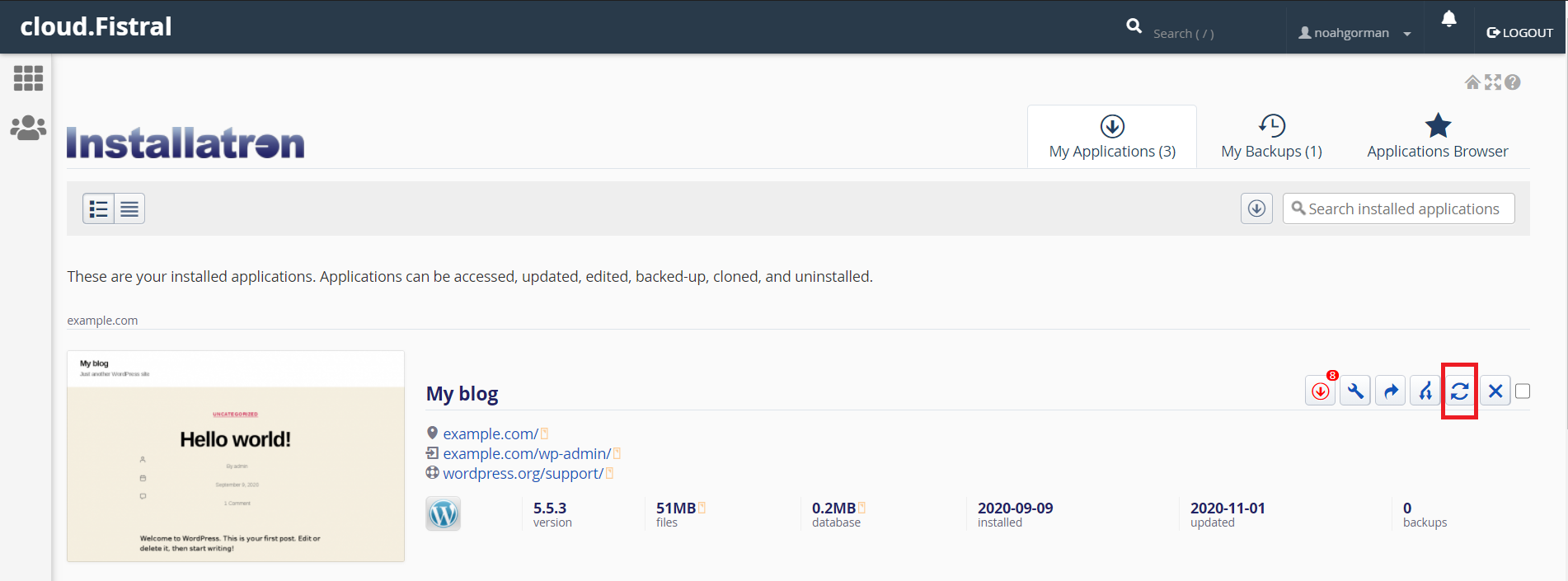 7. Now you've created your staging site, you can sync any changes from the staging site to the live site by clicking the sync button, on the live site in Installatron.