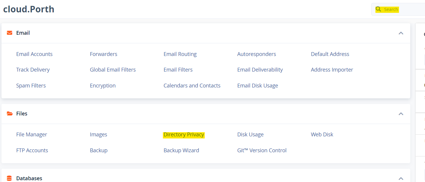 2. Now you are logged onto your cPanel hosting plan, use the search bar to find 'Directory Privacy'