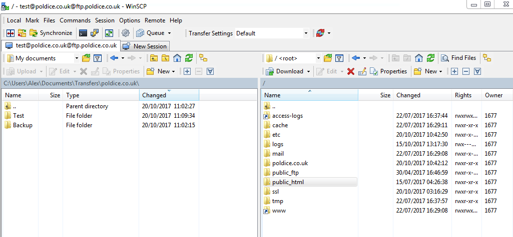3. Now you are connected, you will see two panes, the left side is your local folder structure and the right side is the remote servers folder structure. The contents of your website will be within a folder called “public_html”, every document for your website should be inside this directory.