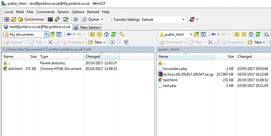 5. To upload or download files, simply drag and drop them into place. As an example I have dragged the file “test.html” from my local computer (left pane) to the server (right pane). This would now mean that you could access that file by going to www.yourdomain.co.uk/test.html.